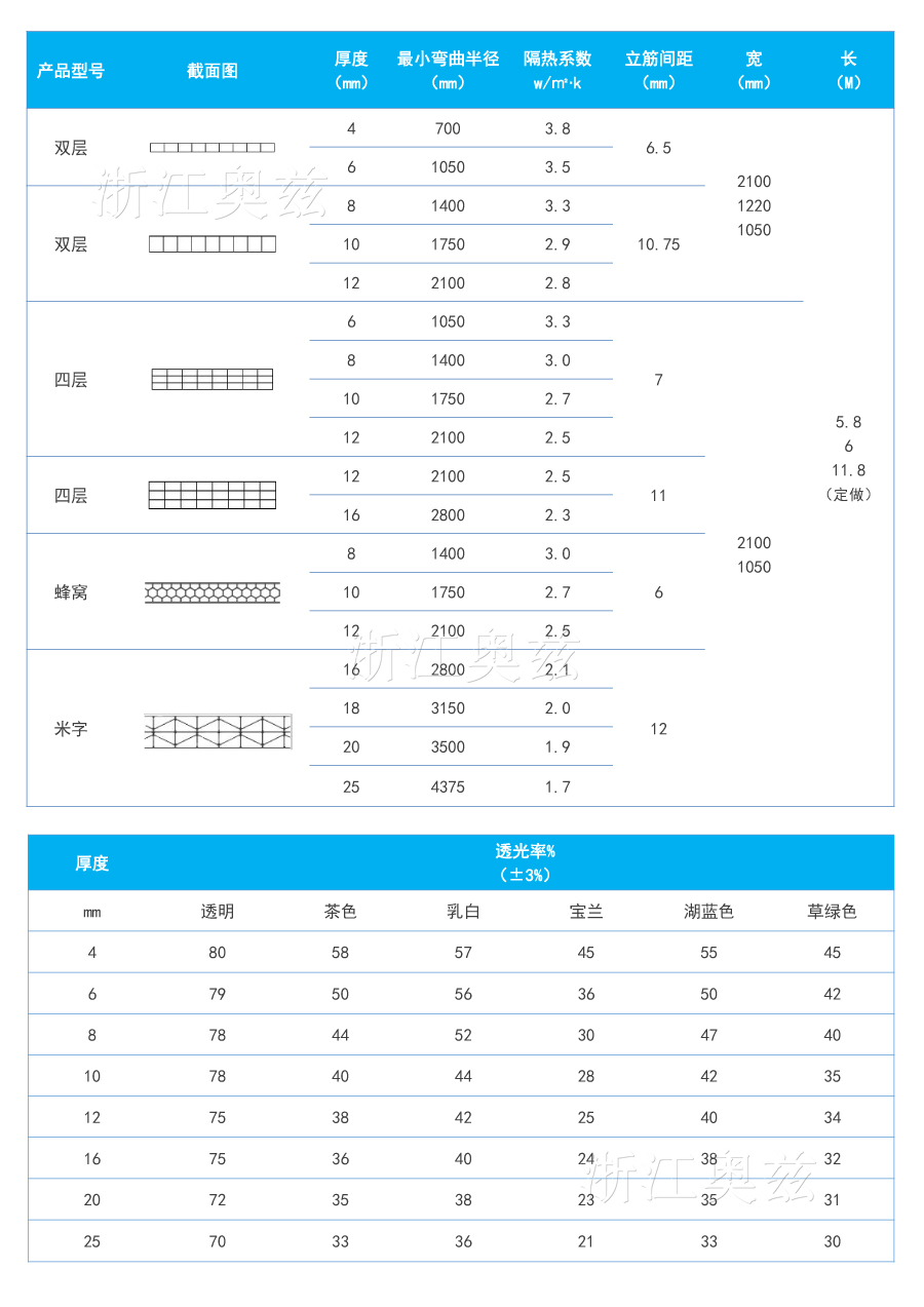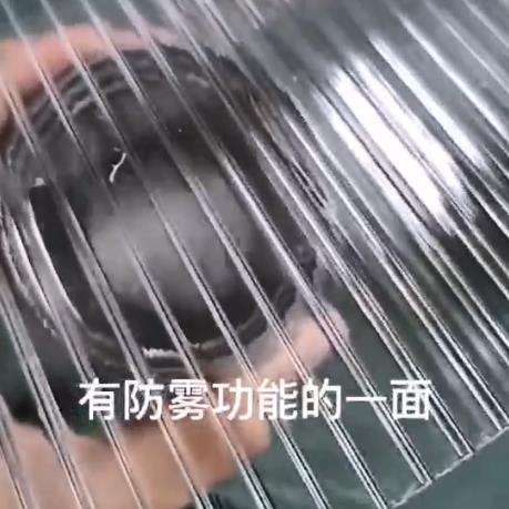 【没想到阳光板还有防雾功能,真的太神奇了!】什么是防雾滴阳光板?防雾阳光板是在普通阳光板的基础上,增加的一种防雾功能。这种防雾功能是以涂层的方式涂覆在阳光板底面,主要原料是液体的醇溶剂,通过滚筒覆着涂覆,然后经高温烘烤定型在阳光板底面。应用在什么地方?防雾阳光板主要应用于温室大棚和花房中,冬天室内外温差大,温室内部容易产生水滴覆着在阳光板底面,阻挡了阳光板温室的透光率,并且水滴会灼伤植物的嫩芽。防雾阳光板很好的解决了农业温室大棚的这一痛点,而广受大家喜欢。防雾阳光板也可以弯曲使用,弯曲半径和普通阳光板一样。请参照阳光板弯曲半径表:《阳光板和耐力板可以弯曲成弧形安装吗?》